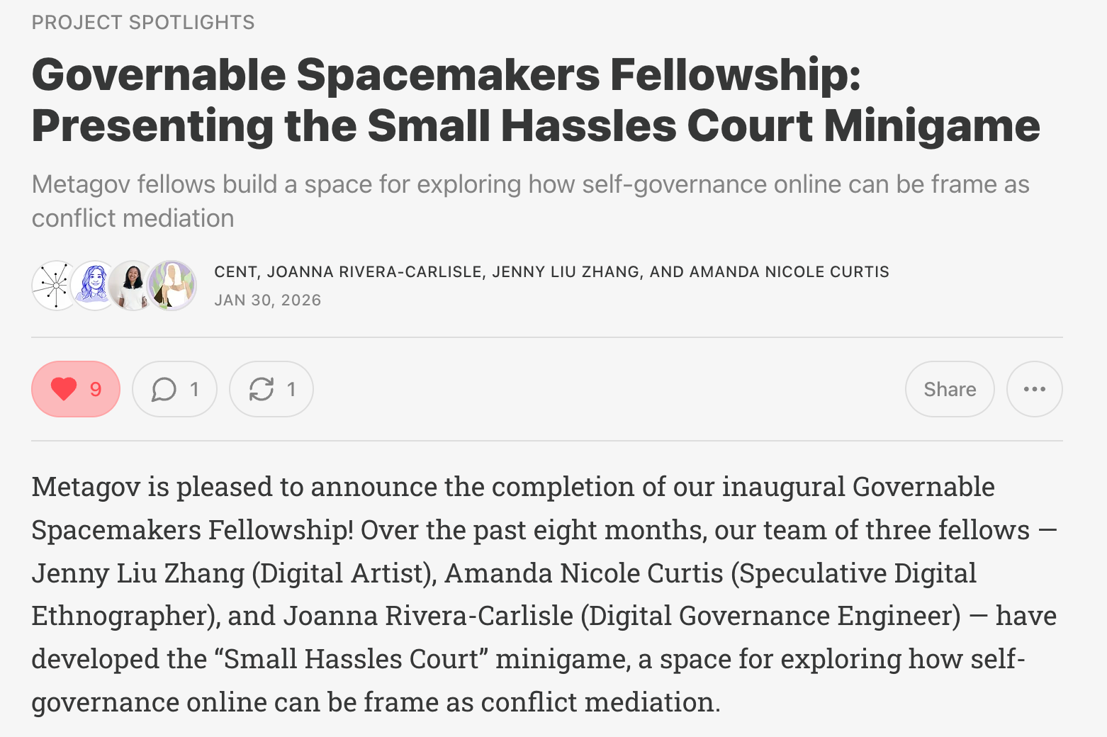 Congratulations to our sister group Plot Twisters on the successful completion of the Governable Spacemakers Fellowship through Metagov. Their project, Small Hassles Court, is an experiment in community governance and digital space design, and an early-stage mini-game within the forthcoming EdTech gameworld, Twisterland. Cat Chang continues to drive momentum on other Plot Twisters initiatives, with articles in development exploring reflection, agency, and intentionality in game design.