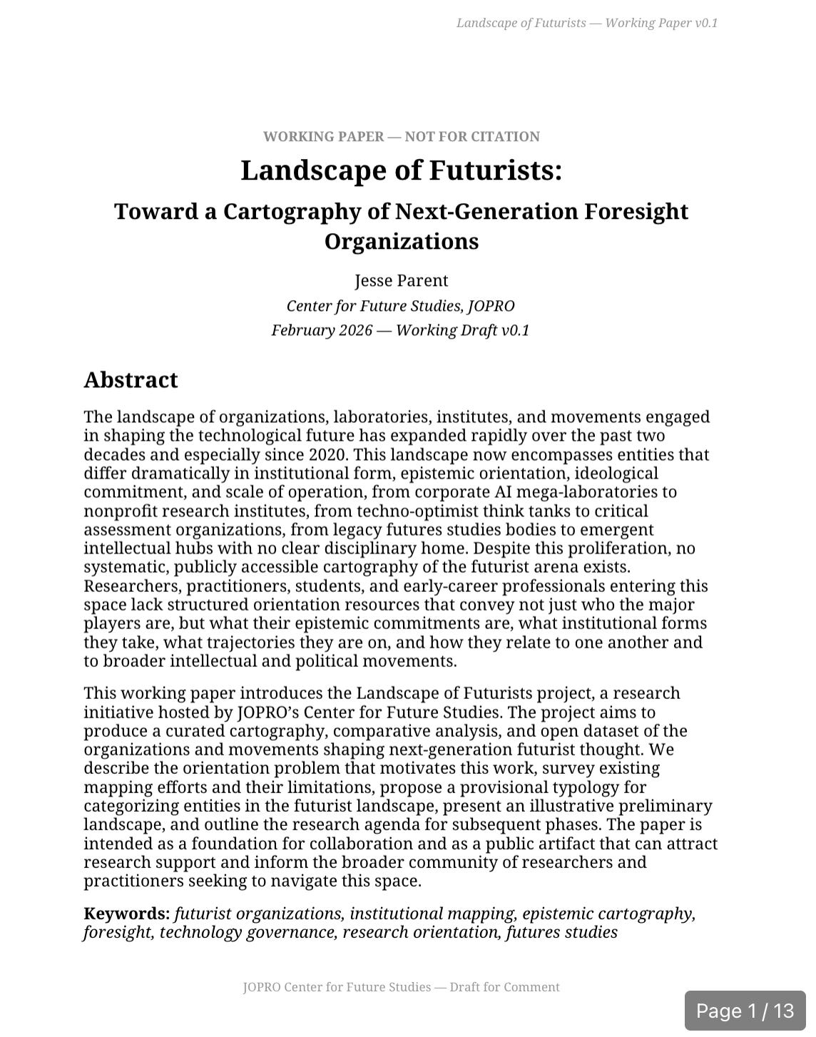 Alongside this, a related project has been taking shape: A Field Guide to the Futures Ecosystem: Mapping Organizations, Movements, and Intellectual Currents (working title). A limited preview and preliminary working paper will be made available on OSF. The Field Guide applies mapping principles developed through FrontierMap to chart the broader ecosystem of organizations shaping technological futures.